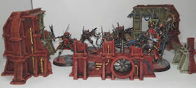 Para rematar, se ha pintado también el set de ruinas de escenografía que traía la caja, que en realidad son cinco piezas. Dos "L" de una planta, dos especies de barricadas y un elemento que representa una puerta o escotilla en el suelo. He optado por colores distintos en las dos caras (interior y exterior), algo que no había hecho en ninguna de las ruinas de 40k pintadas hasta ahora. Una con el esquema del Mechanicum y otra con el esquema del clan Pestilens.